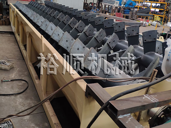 螺旋洗石機(jī)主要由槽體、減速機(jī)、電機(jī)、中心軸、螺旋葉片、支架組成。支架焊接在中心軸上,螺旋葉片裝好后用螺栓壓緊,使葉片不下垂不變形。